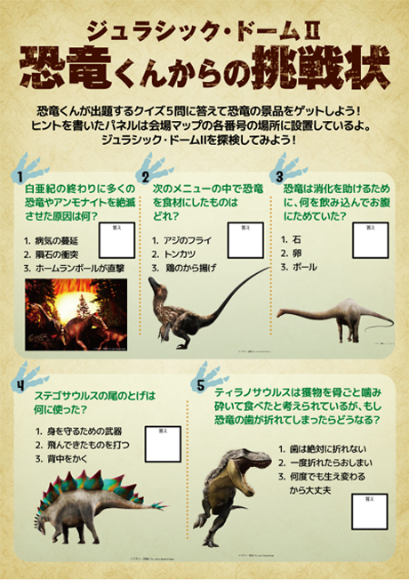 恐竜くんから恐竜に関するクイズが5問出題されます。見事全問正解した方には、恐竜アイテムをプレゼントします!ヒントが書かれたパネルの場所はクイズラリー配布用紙裏面に書かれてあるので、確認してみよう。