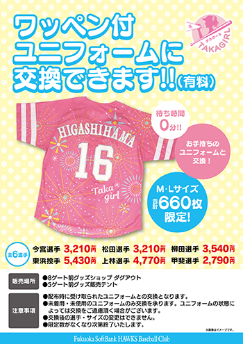 また、3Lサイズユニフォーム引換券の事前販売数が準備数に達しなかった場合、5ゲート前配布ブースにて、タカガールデー当日でも100円にて販売いたします。