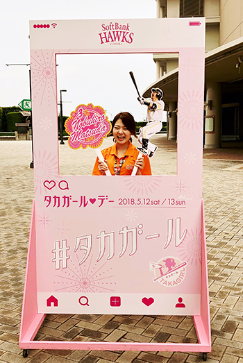 こちらのフォトフレームでタカガールピンバッジのボードを持って写真撮影し、インスタグラム・Twitter・facebookに投稿していただいたお客様限定で、今宮選手・松田選手・柳田選手・東浜選手の専用筐体をご利用いただけます!