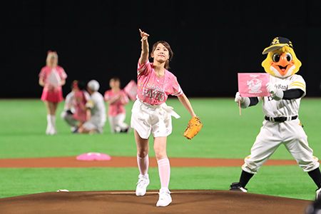 また、毎年行われている「ピンクリボン運動」の推進活動も行われました。各ベースをピンクカラーに染めたり、ホークスビジョンもピンク仕様になったり、本当に華やかな一日に。また、選手たちも帽子の「Sh」マークの隣にシンボルマークの付いた特別仕様を着用して試合に臨みました。(ピンクリボン運動については別記事を参照ください)