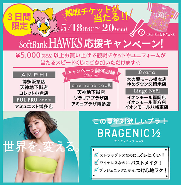 福岡県にあるワコール直営ショップのアンフィ・ウンナナクール・ブララ・ランジェノエルで、ホークスの野球観戦チケットやタカガールユニフォームが当たるキャンペーンを開催!