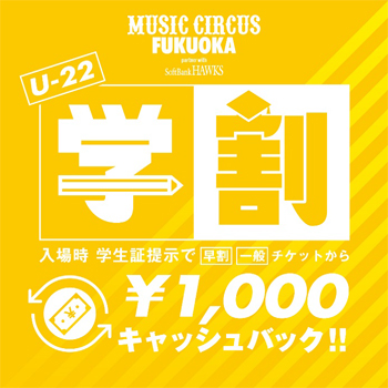 | 学割対応 | ご入場時に入場チケットとご本人名義の学生証(顔写真付き)をご提示いただくと、その場で1,000円がキャッシュバックされます。 ※超早割チケットは対象外 ※注意事項は公式ホームページをご覧ください。 |