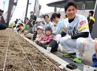 ホークスからは若鷹寮で生活をする栗原陵矢選手と九鬼隆平選手が参加。筑後市に住む小学生以下の子どもたちと保護者、約20組の親子と一緒にスコップを片手に、慣れない手つきながら丁寧にまずは苗を植えていきました。栗原選手は「初めての経験」と笑顔。九鬼選手も「このような交流も楽しかった」とこちらもニコニコ顔でした。