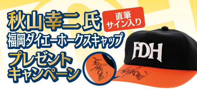 ホークス公式通販ショップ ダグアウトにて、『ホークス80年史vol.2 フルスイングの系譜』含む5,000円以上ご購入の方の中から抽選で2名様に「秋山氏直筆サイン入り福岡ダイエーホークスキャップ」をプレゼントいたします。