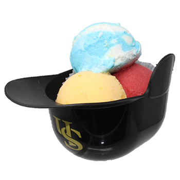 交流戦で対戦するチームカラーの「ブルー」、「オレンジ」、「レッド」のカラーにちなんだ3種のアイスを、ヘルメットに盛り付けました!