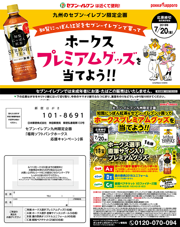 2018年6月11日(月)~7月20日(金)までの期間中、セブン-イレブンにて「知覧にっぽん紅茶」を含む、540円(税込)以上お買い上げのレシートを1口として、応募すると「ホークス選手の直筆サイン入りプレミアムグッズ」など様々賞品が当たるキャンペーンを実施中!!!