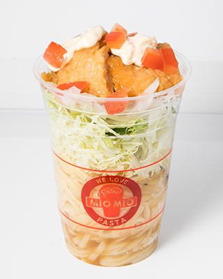 宮崎のご当地メニューのチキン南蛮をメインにしたサラダパスタ。たまねぎのシャキシャキ感がアクセント!