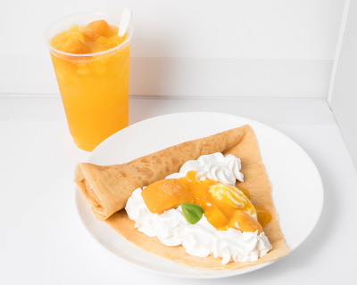 宮崎イメージの果物マンゴーを使用したマンゴーレアチーズケーキクレープとプレミアムドリンククリスタル&アイシーマンゴードリンクのセットにしました!