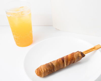 9’州うまかもん屋台ワゴンで人気の肉巻きおにぎり棒と宮崎マンゴー果汁使用したチューハイのセットメニュー。