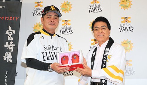 そして1日には、工藤公康監督へ激励の品も授与されました。宮崎市・戸敷正市長からは「宮崎産 完熟マンゴー 太陽のたまご」、都農町・酒井雅彦副町長からは「都農産ワインと尾鈴豚ハム・ソーセージセット」、都城市・池田宜永市長からは「霧島酒造『黒霧島 益々繁盛』」がそれぞれ贈られました。