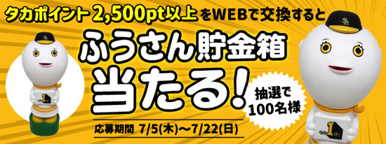 ポイントプログラム「タカポイント」では、7月5日(木)から22日(日)までふうさん貯金箱(非売品)が当たるポイント交換プレゼントキャンペーンを実施します。