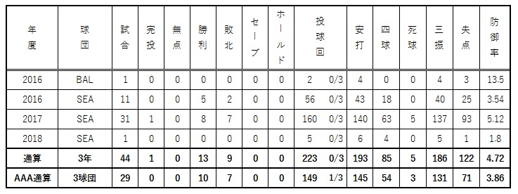 | 球歴 | Norfolk Tides(AAA)2016, Baltimore Orioles 2016, Seattle Mariners 2017-,Tacoma Rainiers(AAA)2018, |