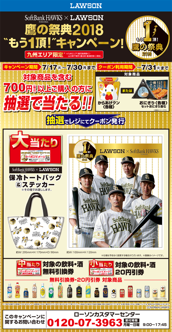 ローソン(九州エリア限定※)では、店頭福岡ソフトバンクホークスのオリジナルグッズがその場であたる、「鷹の祭典2018 “もう1頂“キャンペーン」を店頭で実施中です!