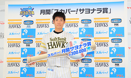 「月間スカパー!サヨナラ賞」は月間を通じて最もインパクトのあるサヨナラ打等を放った選手に贈られており、上林選手は6月29日(金)のマリーンズ8回戦(ヤフオクドーム)で、自身プロ5年目で初となるサヨナラ打を放ちました。