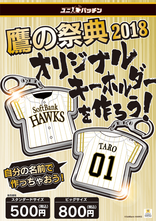 | 購入方法 | ①13:00~ 整理券配布 当日の観戦チケットをお持ちの方に【選手別購入整理券】を配布します。 整理券をお渡しする際、当日の観戦チケットを確認いたします。 ②14:00~試合開始まで 有料交換 未着用の「鷹の祭典2018レプリカユニフォーム(Lサイズ)」と選手別購入整理券を特設売場までお持ちください。ワッペンをご購入いただく形式でワッペン圧着済レプリカユニフォームと交換いたします。 |