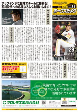 福岡市・糸島市と福岡ソフトバンクホークスの包括連携協定事業の一環として、『ホークスだより』を発行しています。7月号は、今シーズン先発ローテーションの一角を担う石川柊太投手が登場。イベント情報やプレゼント企画、公式戦優待チケットのお知らせもあります。夏休みはもうすぐ!ご家族揃ってヤフオクドームへお越しください!