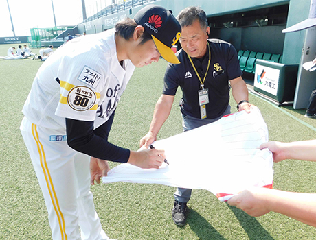開催日にホークスが勝利した場合は、このユニフォームに当日のヒーロー(若鷹スピーチをした選手)のサインを直接もらえます!