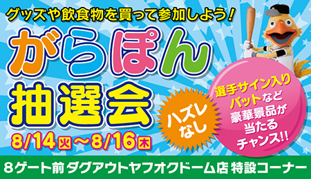 | 抽選会会場と抽選時間 | ダグアウトヤフオクドーム店 特設会場 15:00~試合終了後1時間 ダグアウト小倉店 10:00~20:00 |