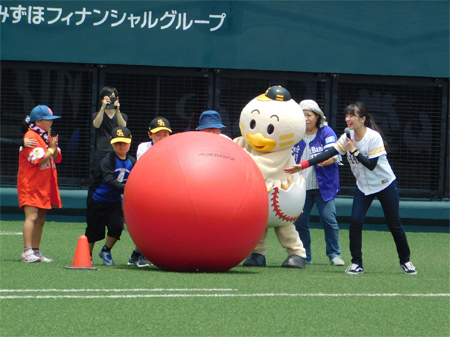 試合開始前に‘ひな丸チーム☆カビーチーム’の2チームに分かれてグラウンドで「大玉ころがし」対決を行います!