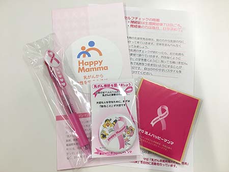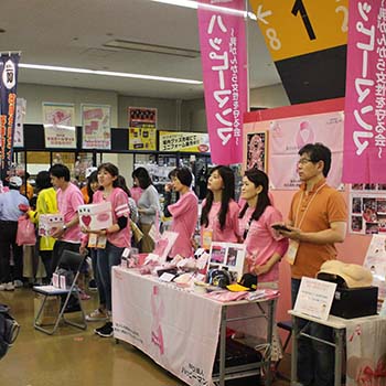 球場前広場のハッピーマンマ特設ブースでは、乳がん解説パネル展示、乳がん触診模型を使っての自己検診法の指導やリーフレット配布、オリジナルピンクリボングッズ販売を通して乳がん早期発見のための啓発活動を行います。みなさん是非お立ち寄りください!