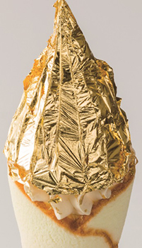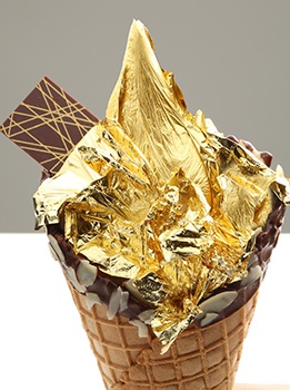 衝撃!贅沢にも金箔をまるまる1枚使ったデザート!チョコトッピングのあるデコソフトゴールド、ラングドシャコーンのクレミアゴールド
