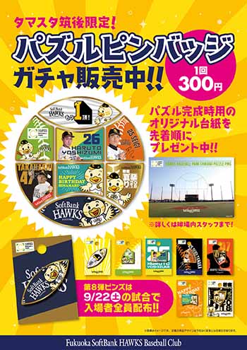 またこの日は、今回で第8弾となるタマスタ筑後のキャラクター「ひな丸」とホークスロゴオリジナルデザインのピンバッジを、観戦来場者の方全員にプレゼント!