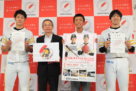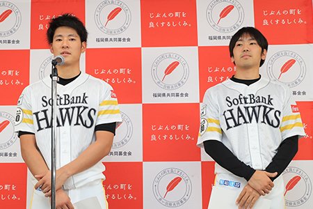 石川柊太投手と上林誠知選手が、福岡県共同募金会の「福岡県 赤い羽根応援大使」を務めます。ホークスの選手が応援大使を務めるのは7年目となります。