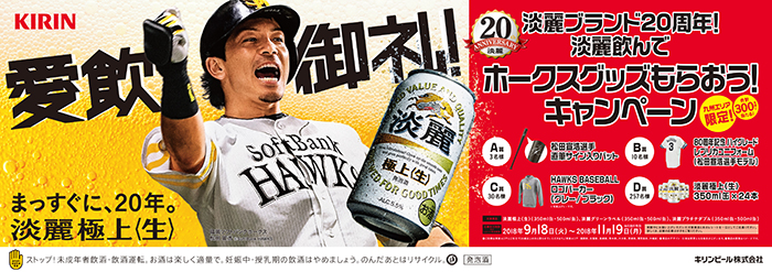 今年で発売20周年の「淡麗極上<生>」が「淡麗飲んでホークスグッズもらおう!キャンペーン」を実施中!松田選手サイン入りバットや80周年限定松田選手レプリカユニフォーム、ホークスパーカーなどプレゼント!