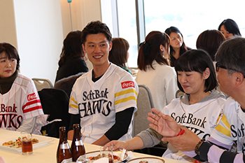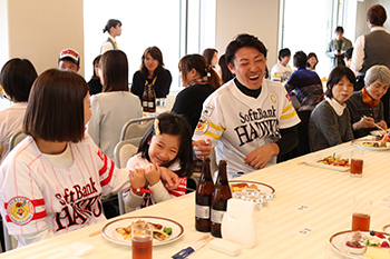 ヤフオクドーム5ゲートにある「おふぃしゃる居酒屋 鷹正」。ファンフェスティバル当日は、「選手サロンカレー専門店 鷹正」として1日限定営業!シーズン中は選手サロンで選手が食べているカレーをファンフェスティバル限定で提供します。この選手サロンカレーとファンフェスティバル入場券がセットになったお得なチケット。しかも、このカレーはなんと選手がお皿についでくれます!