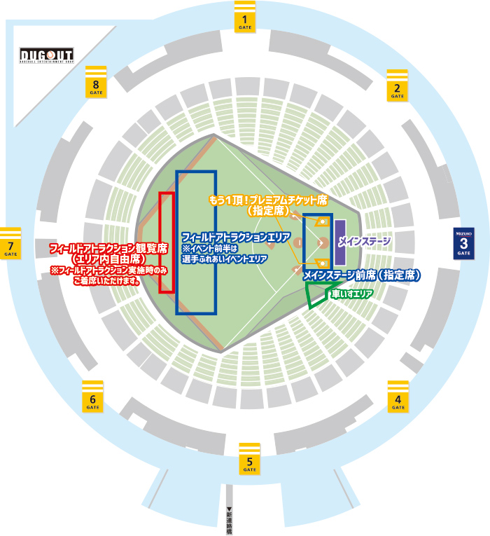 「メインステージ前チケット」、「フィールドアトラクション観覧席チケット」の座席位置