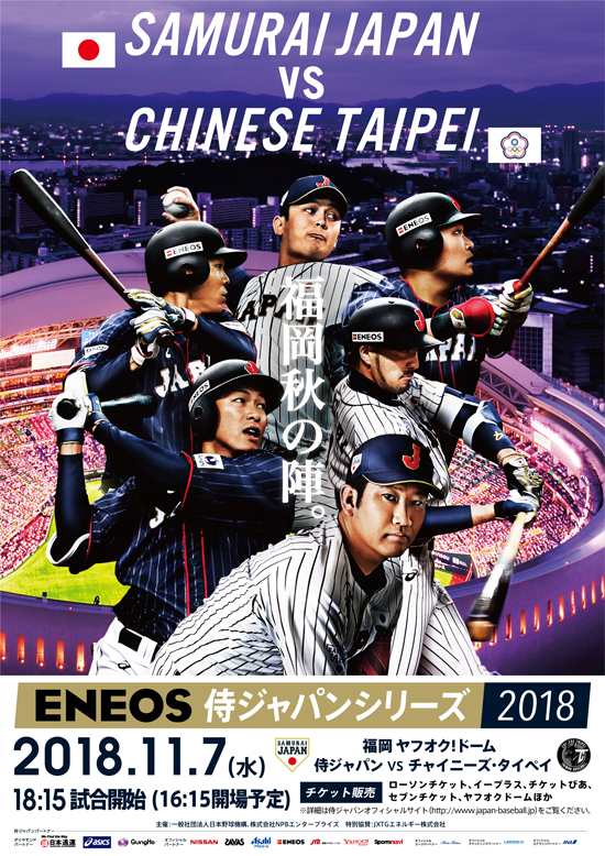 11月7日(水)ENEOS侍ジャパンシリーズ2018「侍ジャパン VS チャイニーズ・タイペイ」のチケットは、発売中です。ユニフォームや野球グローブのついた企画チケットも同時発売! 一般チケット・企画チケットに関する詳細はこちら