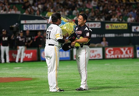 工藤公康監督、井口監督から大きな花束を受け取って、打者1人との対戦を終えてベンチに下がった大隣投手。スタンドからは敵味方関係なく割れんばかりの拍手がおくられる中、トレードマークである笑顔を最後まで絶やすことのないままマウンドを去りました。