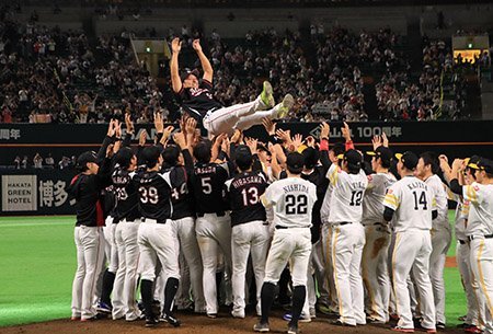 また、試合後はマリーンズが今季福岡最終戦とあってスタンドへ挨拶。その中には大隣投手の姿もありました。そしてホークスの選手たちもグラウンドに飛び出し、マウンドで大隣投手を高々と胴上げしました。