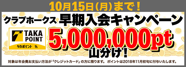 10月15日(月)までに、2019年度クラブホークスへクレジットカード支払いにて新規または継続入会いただくと、タカポイント500万ptを山分け!