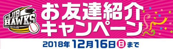 | 新規入会特別特典 | ヤフオクドームで新規入会していただいた方には通常特典に加え、以下の商品の中から1点プレゼントします! 鷹の祭典2018レプリカユニフォーム(SまたはLサイズ) ![]() ![]() ![]() ![]() ※サイズ・数量には限りがございます。 ※新規入会者のみ。継続入会での特別特典はございません。 |