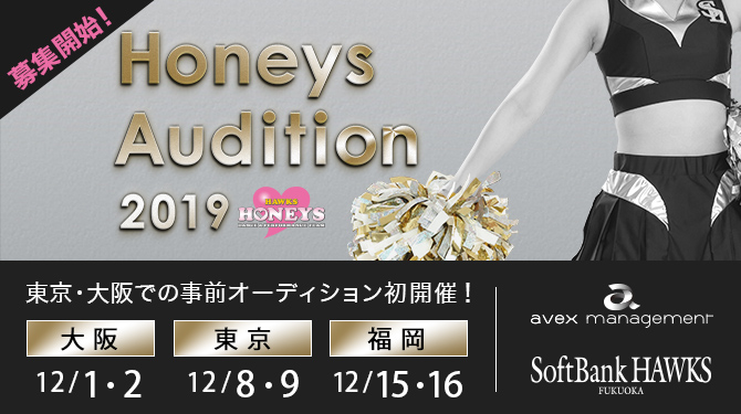 福岡ソフトバンクホークス株式会社(本社:福岡市中央区、代表取締役社長:後藤芳光)は、ホークスオフィシャルダンス&パフォーマンスチーム「ハニーズ」の2019年度メンバーオーディションを開催いたします。世界一のパフォーマンスチームとなるべく、初めて球団所在地以外の東京・大阪でも事前オーディションを行います。