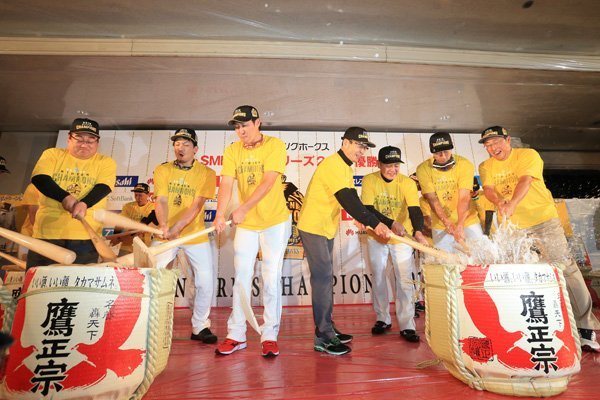 そして柳田悠岐選手が乾杯の音頭。「最高に盛り上がっていきましょう。亀田史郎さんの『3150』、サイコーで」と声を上げ、「日本一の乾杯の音頭いただきます、サイコー!」の掛け声とともにビールかけがスタートしました。