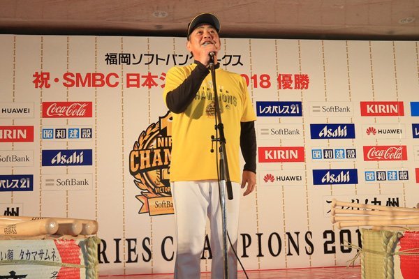 「今日来ていただいたホークスのファンの方、本当にありがとうございました。福岡で待ってくださるファンにも日本一の報告が出来て嬉しいです。全国のホークスファンの皆さん、選手の頑張りで日本一になることができました。僕は本当に幸せな人間です。選手のみんなお疲れ様」