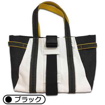 正面センターにホワイトデニム、サイド・背面・底面・持ち手にはブラックデニムを使用。内装などに黄色を使うことでアクセントを出しています。