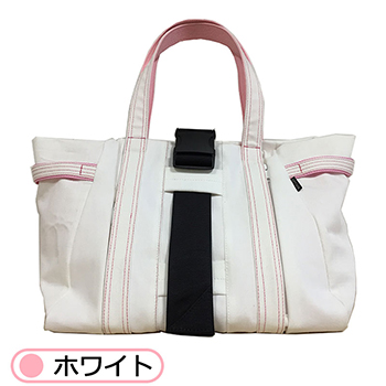 白とピンクのタカガールにオススメバッグ! 全体をホワイトデニムで覆い、ピンクの内装やテーピングで、可愛らしさを演出しました。底面にブラックデニムを使うことで汚れを気にせず、アクティブにお使いいただけます。
