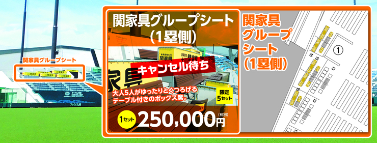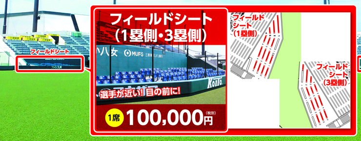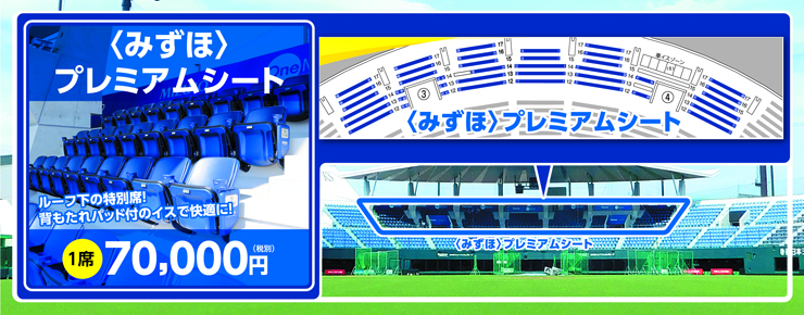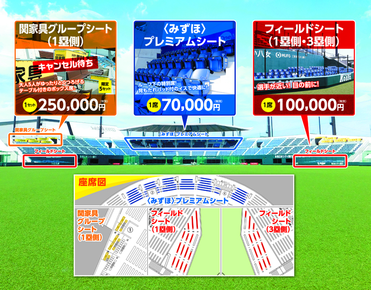 「フィールドシート」・「〈みずほ〉プレミアムシート」と、大人5名が観戦できる「関家具グループシート」という、人気の3種類よりお客様の観戦スタイルに合わせてお選びいただけます。