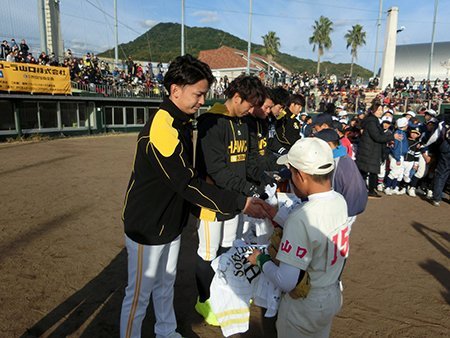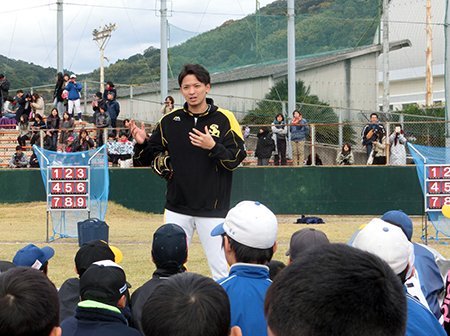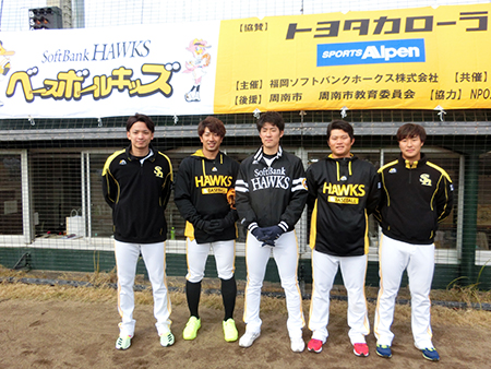 「ベースボールキッズ」としては初開催となった山口県周南市の会場では東浜巨投手、西田哲朗選手、上林誠知選手、美間優槻選手、長谷川宙輝投手が講師を務めました。