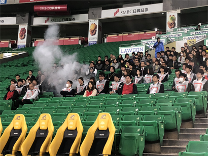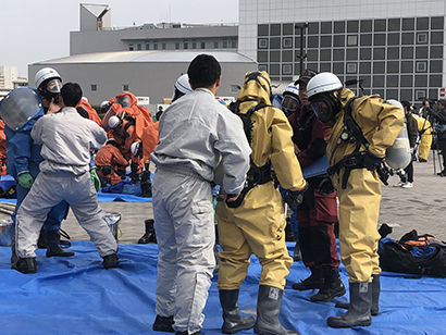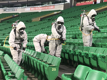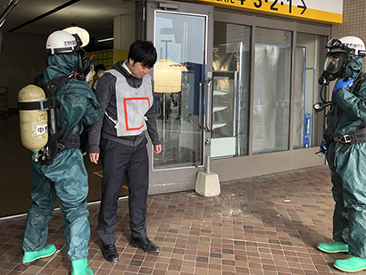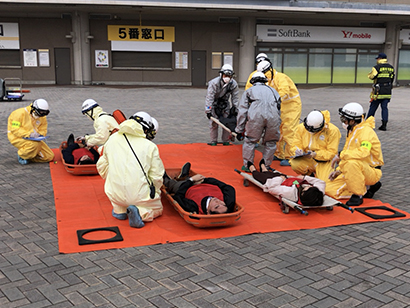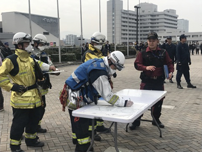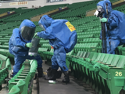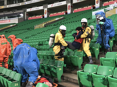 ヤフオクドームにおいてプロ野球開催中、何者かが観客席で化学剤を撒き、発生した有毒ガスにより傷病者が多数発生したという想定のもと、警察・消防通報や避難誘導等の自衛消防隊活動を実施し、通報を受けた警察及び消防が、検知活動・被災者の救護・除染活動等、一連の現場活動を各機関との情報共有、連携を行い、協力体制の確認を行います。
