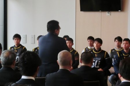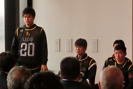また、選手を代表して1巡目入団の甲斐野央投手が「みんなそれぞれ目標は違うかもしれませんが、同じ志をもっています。野球人としてこの素晴らしい環境の中でやり、また私生活でもプロ意識を持ってこれからやっていきたいです」と誓いの言葉を述べました。