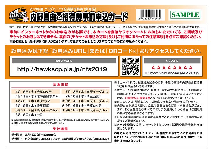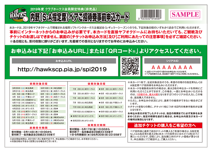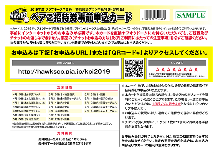 ビジターチケット以外のチケット特典は、事前にインターネットからのお申込みが必要です。本カードを直接ヤフオクドームにお持ちいただいても、ご観戦およびチケットのお渡しはできません。各日程とも、受付枚数に限りがございます。先着順での受付となりますのでお早めにお申込みください。
