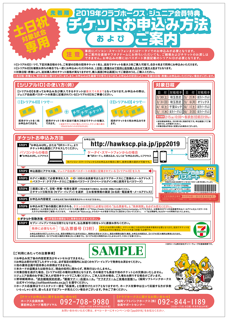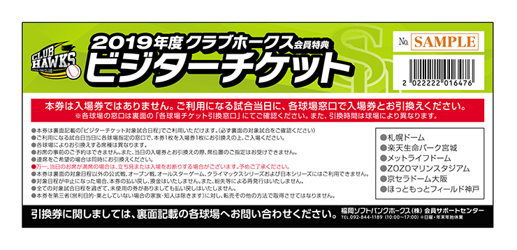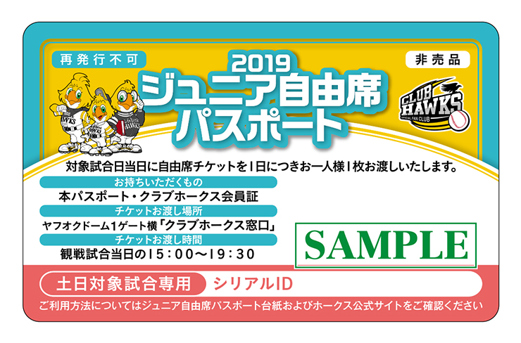 対象試合当日に、ヤフオクドーム1ゲート横「クラブホークス窓口」にて、本パスポートと会員証をご提示いただくとチケットを1枚お渡しします。