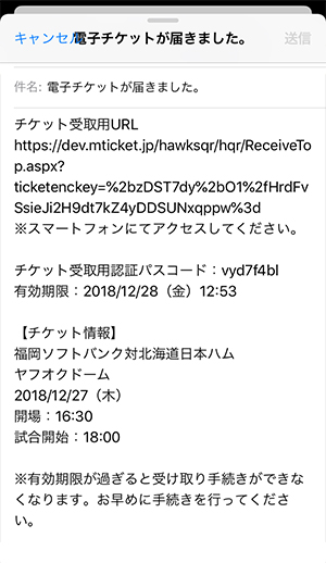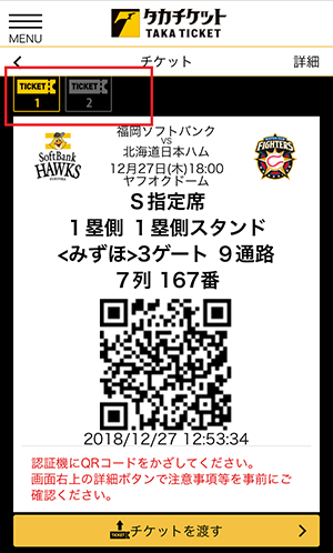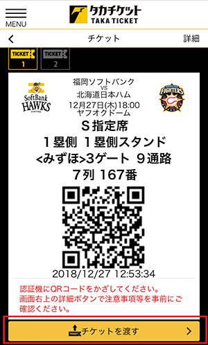 チケットを開くと、チケット情報の確認ができます。(※試合開始6時間前にチケット内にQRコードが表示されます。)