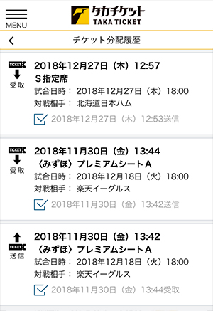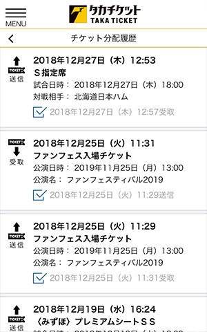 チケット分配の確認は「チケット分配履歴」で確認できます。
