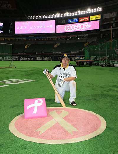 また、NPO法人「ハッピーマンマ」と協力し、2009年から乳がんの撲滅や早期発見の啓発・推進を呼びかける「ピンクリボン運動」の様々な取り組みを実施し、昨年は選手がピンクリボンのロゴマークが付いた特別仕様のユニフォーム・帽子を着用して試合に臨み、試合中もホークスビジョン、各ベース、ネクストバッターズサークルなどをピンク仕様に変えた取り組みを行いました。