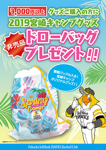 宮崎市生目の杜運動公園野球場で行われる春季キャンプで2月1日(金)よりキャンプグッズや宮崎トロピカル柄グッズを販売します。また、2月1日(金)~2月28日(木)まで1会計につき、グッズ3,000円(税込)以上をご購入の方に非売品ドローバッグを1枚プレゼントします。さらに、大好評の選手イラスト入り缶バッジなどが当たる「若鷹ガチャ」が登場し、9日(土)以降の土日祝限定で、アクリルスタンドやパタパタクリアファイルセットなどが当たる「若鷹くじ」も初開催します!みんなでホークスの春季キャンプを観に行こう!